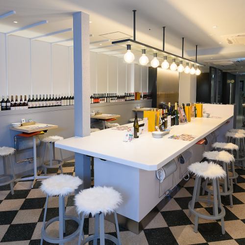 入ってすぐの空間は開放的。大きなカウンターとワインボトルが並びます。広く使えるのでお皿をたくさん並べることができ使い勝手が案外よいですね!